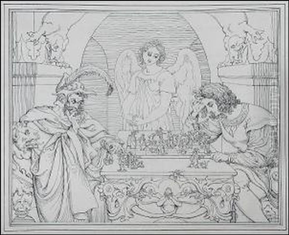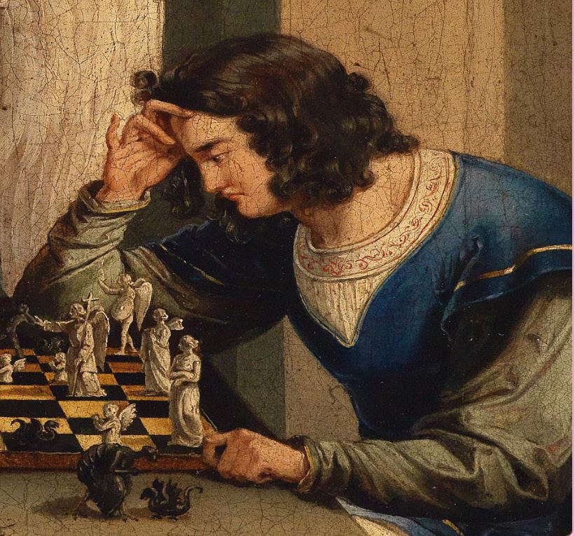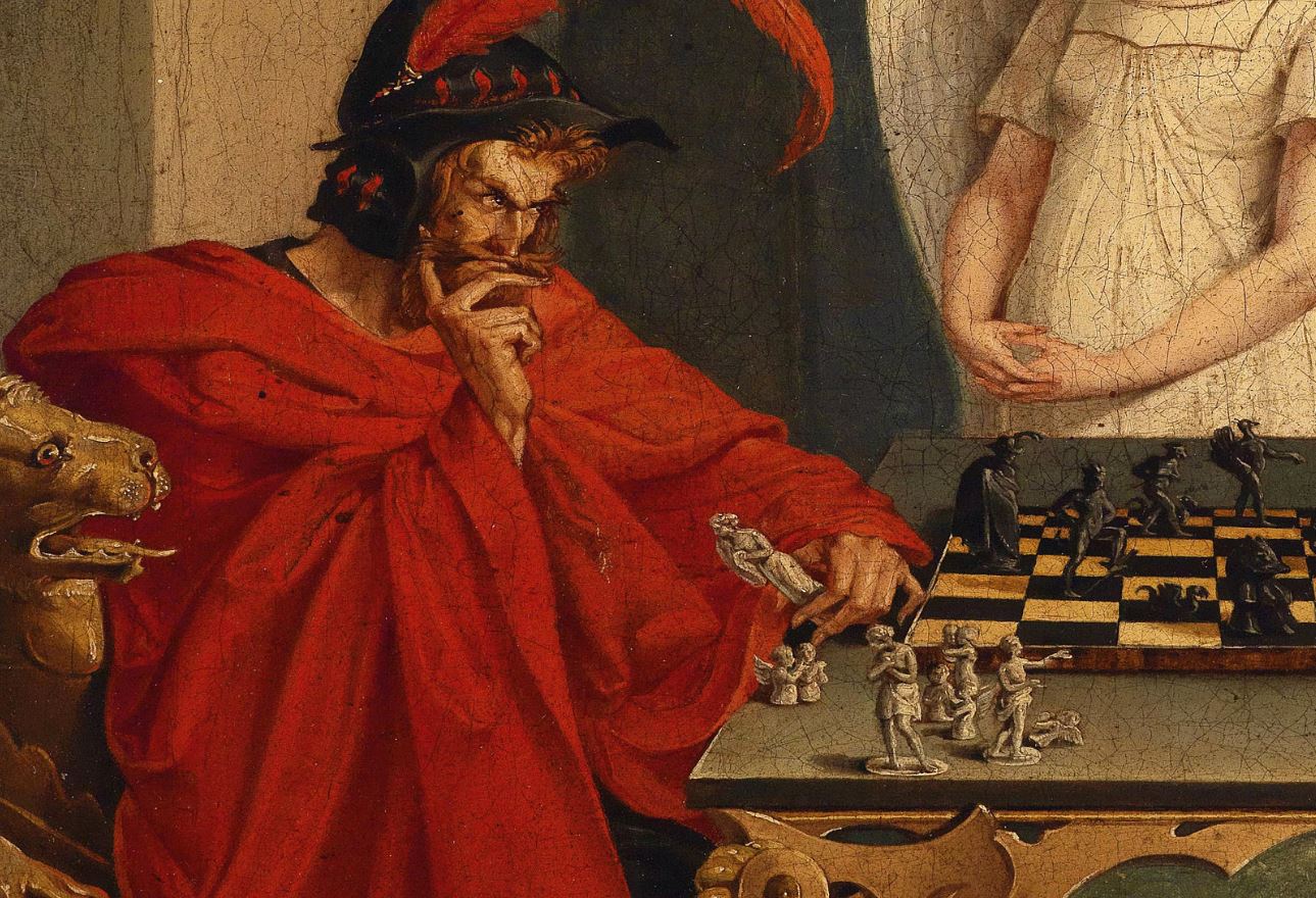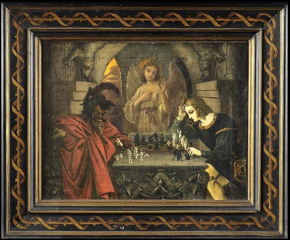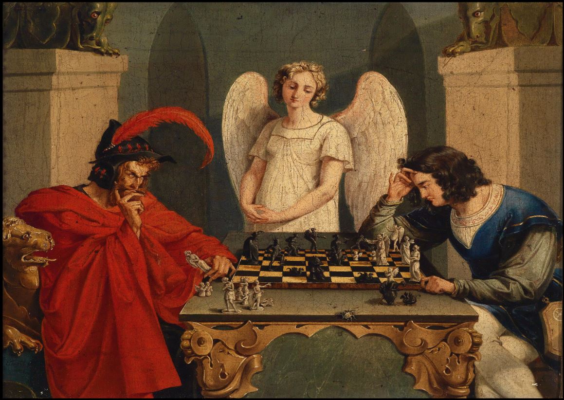 There is no painting in the Louvre called Checkmate. In fact, the original work this story is inspired by is not a painting at all. There are 19th-century engravings/prints by the German artist Friedrich Moritz August Retzsch titled Die Schachspieler (The Chess Players). The scene illustrates Faust playing against Mephistopheles (yes, the same demon as in Ghost Rider), inspired by Johann Wolfgang von Goethe’s work Faust.