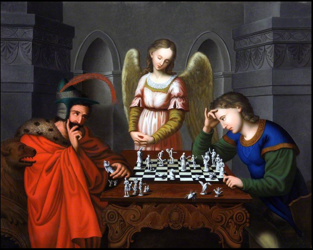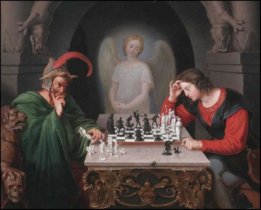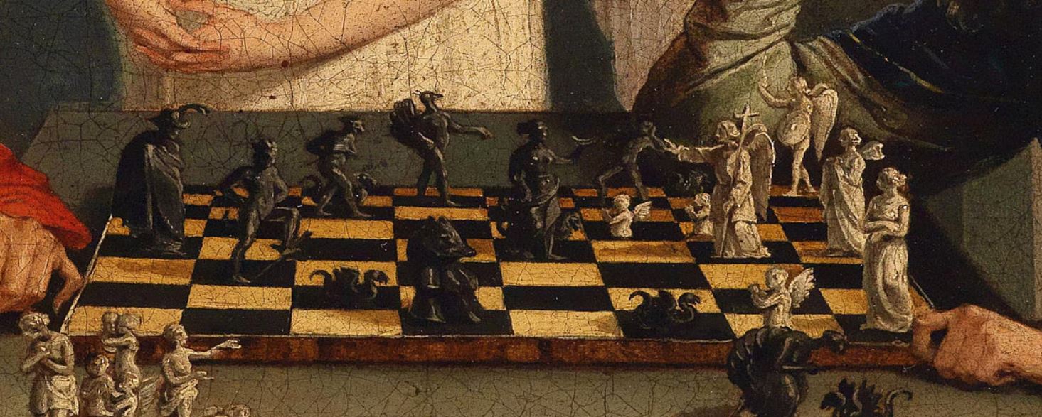It also seems to be his turn to move. He leans over the board, thinking, while the Devil reclines in his chair and watches with a satisfied grin, already knowing his opponent is doomed.